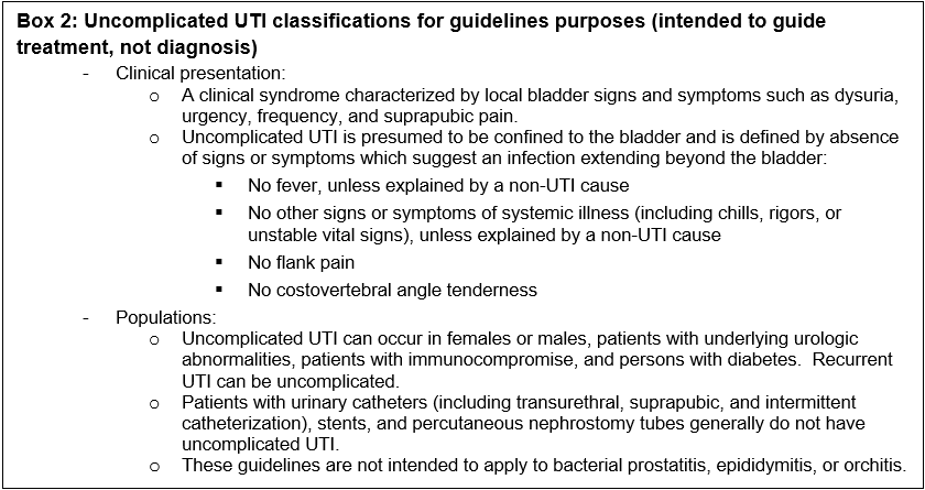 Box 2: Uncomplicated UTI classifications for guidelines purposes (intended to guide treatment, not diagnosis)