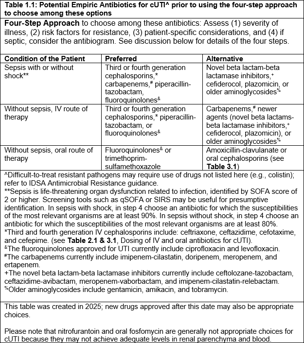 The scope of this clinical question is the empiric choice of antibiotics in suspected cUTI. The guidelines categorize empiric antibiotic choices as preferred versus alternative, stratified for severity of illness. However, when choosing among these antibiotics for a specific patient, a four-step process should be followed to account for changing resistance patterns and individualized patient needs. The guidelines below first discuss the evidence for specific antibiotics or classes of antibiotics that can be used as empiric therapy for cUTI. Then, the four-step approach is discussed, with explanations of the evidence on the potential impact of inappropriate initial antibiotic therapy, the predictive value of specific risk factors for having a resistant uropathogen (including prior urine cultures and prior antibiotic exposure), and modeling approaches for establishing what threshold to use on the antibiogram when choosing empiric antibiotics for a cUTI patient with sepsis. Specifically, the four-step approach is to assess: (1) severity of illness, (2) risk factors for resistance, (3) patient-specific considerations, and (4) if septic, consider the antibiogram. See discussion below for details of the four steps. Finally, the guidelines address choice of definitive therapy when culture results are available.