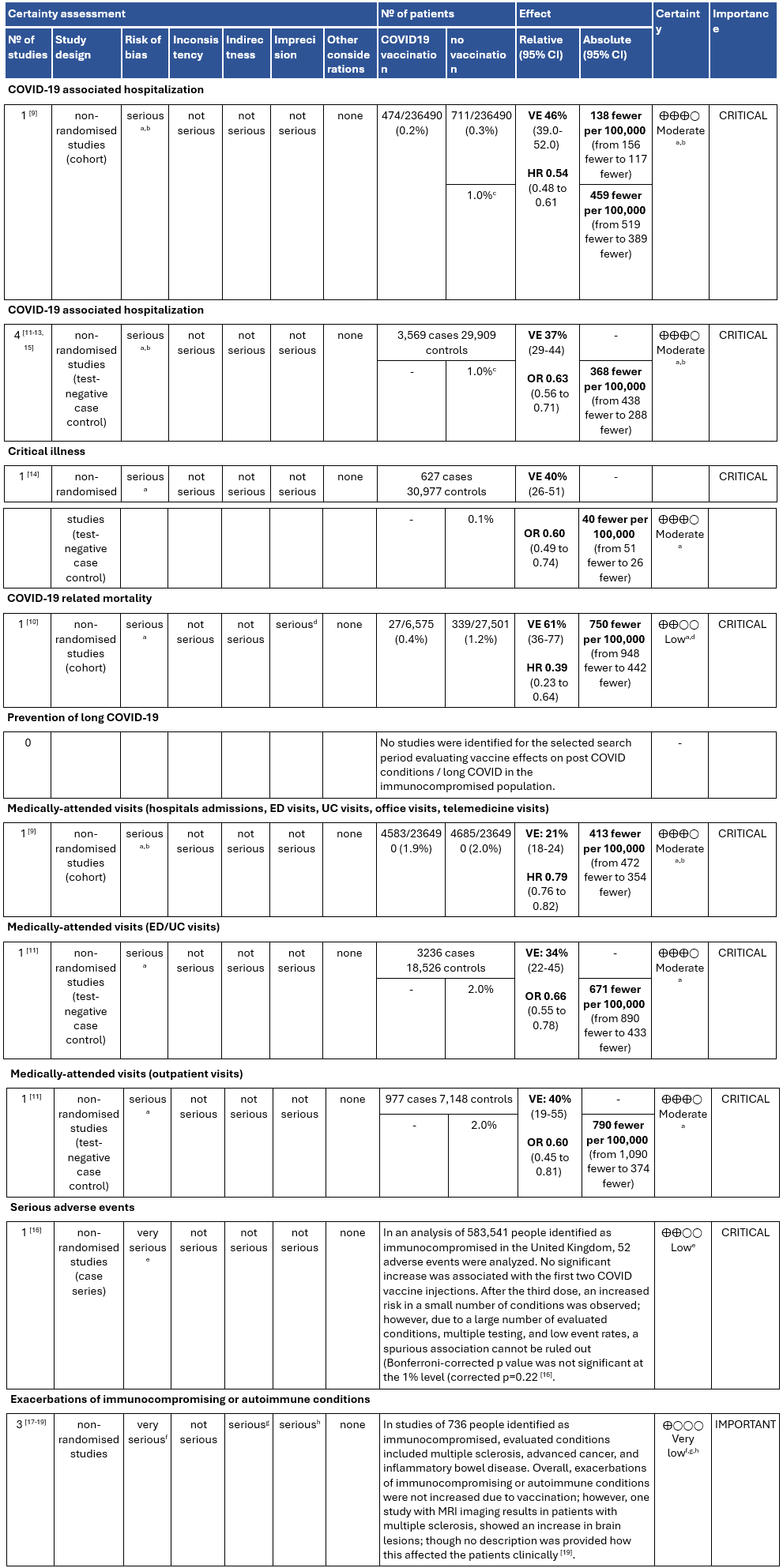 The panel agreed that the overall certainty of evidence is moderate due to evidence on COVID-19 vaccine effectiveness in immunocompromised patients driven by the prevention of hospitalization. The moderate size of beneficial effects combined with little or no serious adverse effects justifies a strong recommendation for the administration of the 2025-2026 COVID-19 vaccine.