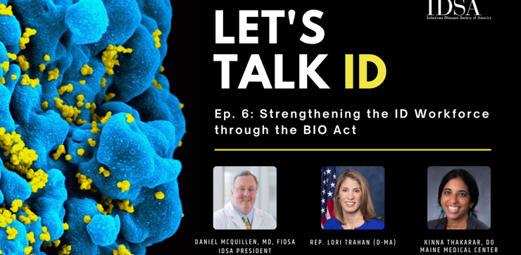 IDSA President Daniel McQuillen, MD, FIDSA is joined by Congresswoman Lori Trahan (D-MA) and IDSA Advocacy Liaison Kinna Thakarar, DO to discuss the Bolstering Infectious Outbreaks (BIO) Preparedness Workforce Act, new bipartisan legislation that would provide loan repayment for medical professionals who work in bio-preparedness or provide infectious diseases care in underserved areas or clinics and facilities that receive federal funding.