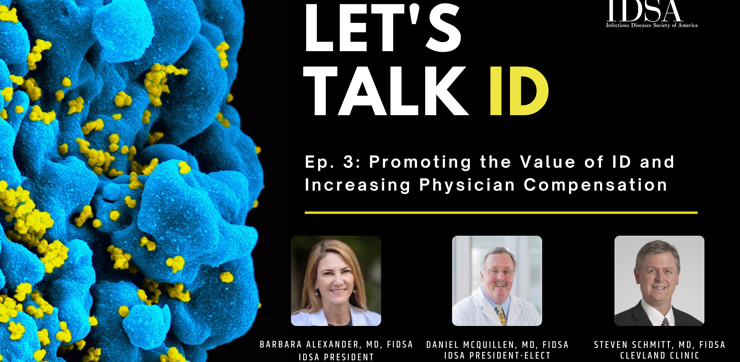 How can ID physicians advocate for improved physician value and compensation? In this episode, IDSA President Barbara Alexander, MD, FIDSA is joined by IDSA President-Elect Daniel McQuillen, MD, FIDSA of Lahey Hospital & Medical Center and Steven Schmitt, MD, FIDSA of the Cleveland Clinic to discuss increasing awareness, public support and compensation for ID professionals.
