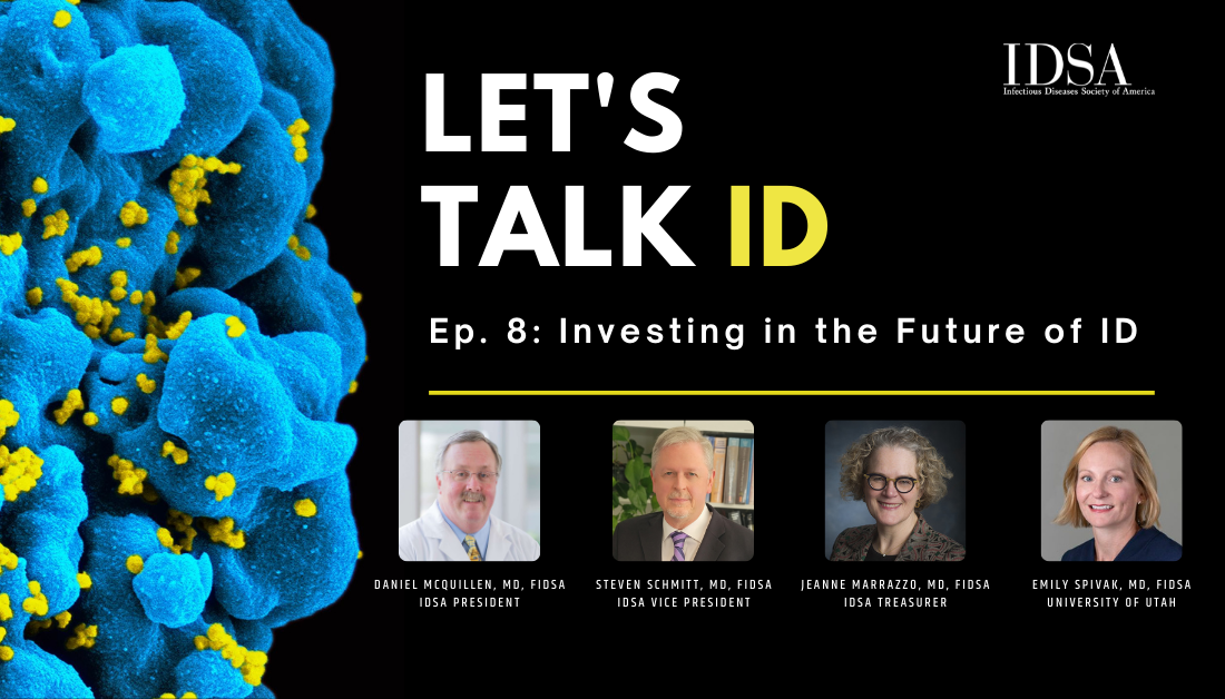 Last fall, the IDSA Board of Directors took a fresh look at IDSA’s strategic plan, understanding that now is the time to seize the moment as the important contributions of the ID workforce during the pandemic are front and center. In this episode, IDSA President Daniel McQuillen, MD, FIDSA, IDSA Vice President Steven Schmitt, MD, FIDSA of the Cleveland Clinic, IDSA Treasurer Jeanne Marrazzo, MD, FIDSA of the University of Alabama at Birmingham and IDSA AMR Committee Chair Emily Spivak, MD, FIDSA of the University of Utah discuss three initiatives in which the Board approved significant investments and how they will positively impact the field of ID.