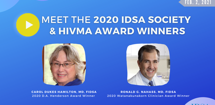 This IDSA podcast series is designed to honor 2020’s Society Award and HIVMA winners. In this episode, we speak to Carol Dukes Hamilton, MD, MHS, FIDSA, recipient of the D.A. Henderson Award, and Ronald G. Nahass, MD, MHCM, FIDSA, recipient of the Watanakunakorn Clinician Award, to discuss controlling the COVID-19 outbreak, how medical communities can address antimicrobial resistance and how 2020 changed ID training.