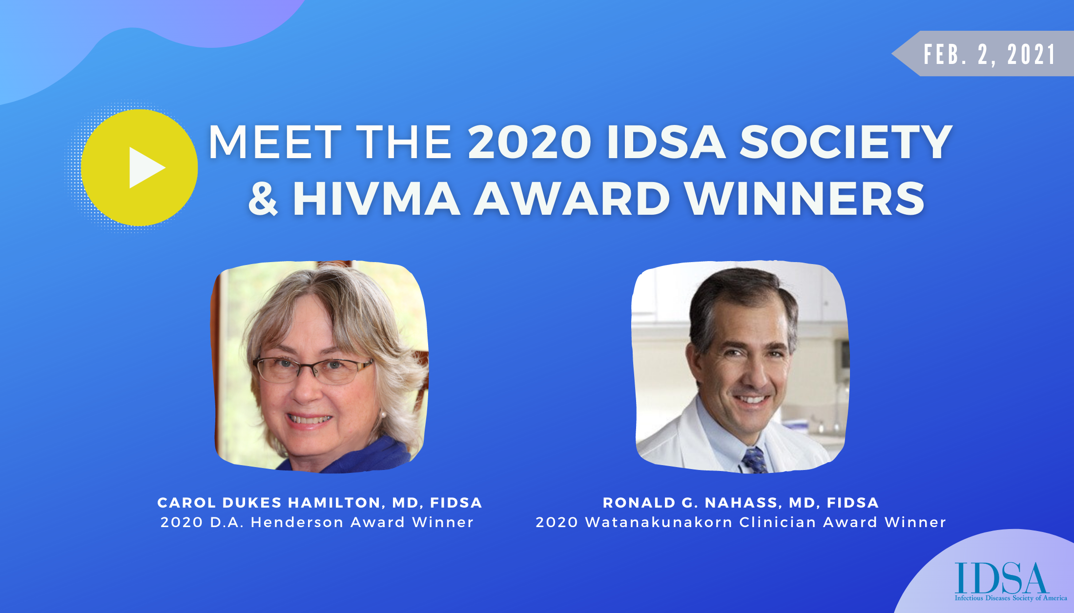 This IDSA podcast series is designed to honor 2020’s Society Award and HIVMA winners. In this episode, we speak to Carol Dukes Hamilton, MD, MHS, FIDSA, recipient of the D.A. Henderson Award, and Ronald G. Nahass, MD, MHCM, FIDSA, recipient of the Watanakunakorn Clinician Award, to discuss controlling the COVID-19 outbreak, how medical communities can address antimicrobial resistance and how 2020 changed ID training.