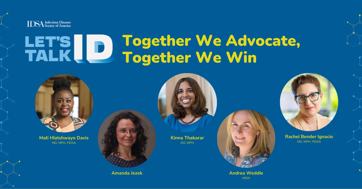 IDSA Board member Mati Hlatshwayo Davis, MD, MPH, FIDSA, discusses the importance of advocacy, including how IDSA and HIVMA members can get involved, with chair and vice chair of IDSA’s advocacy captain subcommittee, Rachel Bender Ignacio, MD, MPH, FIDSA, and Kinna Thakarar, DO, MPH, FIDSA, as well as IDSA senior vice president of public policy and government relations, Amanda Jezek, and HIVMA executive director, Andrea Weddle.