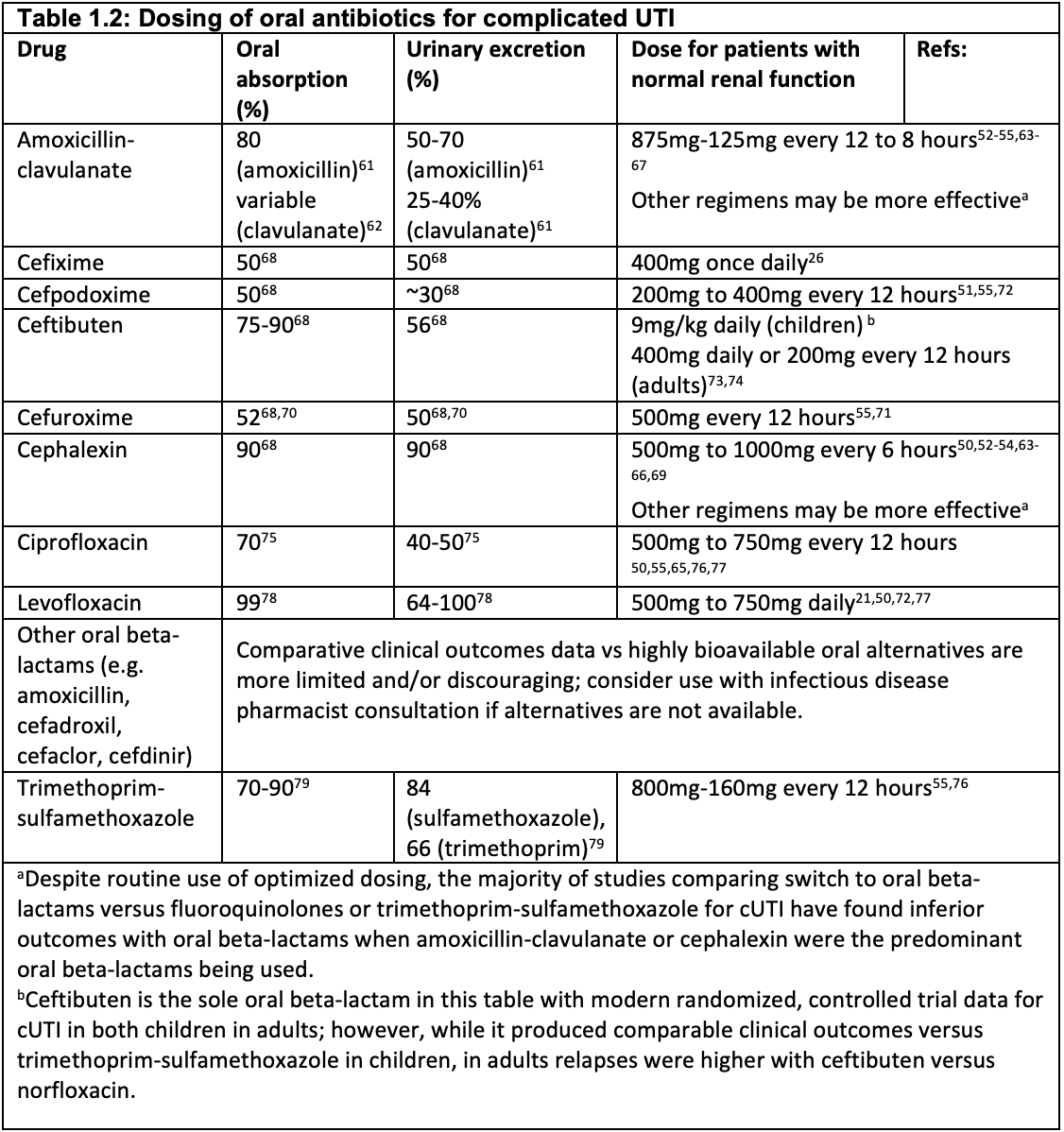 - This recommendation is driven by evidence from trials that primarily studied fluoroquinolones during a time when fluroquinolone resistance was less common. Evidence for short courses of oral beta lactams in cUTI is more limited, and higher doses may be required for efficacy.