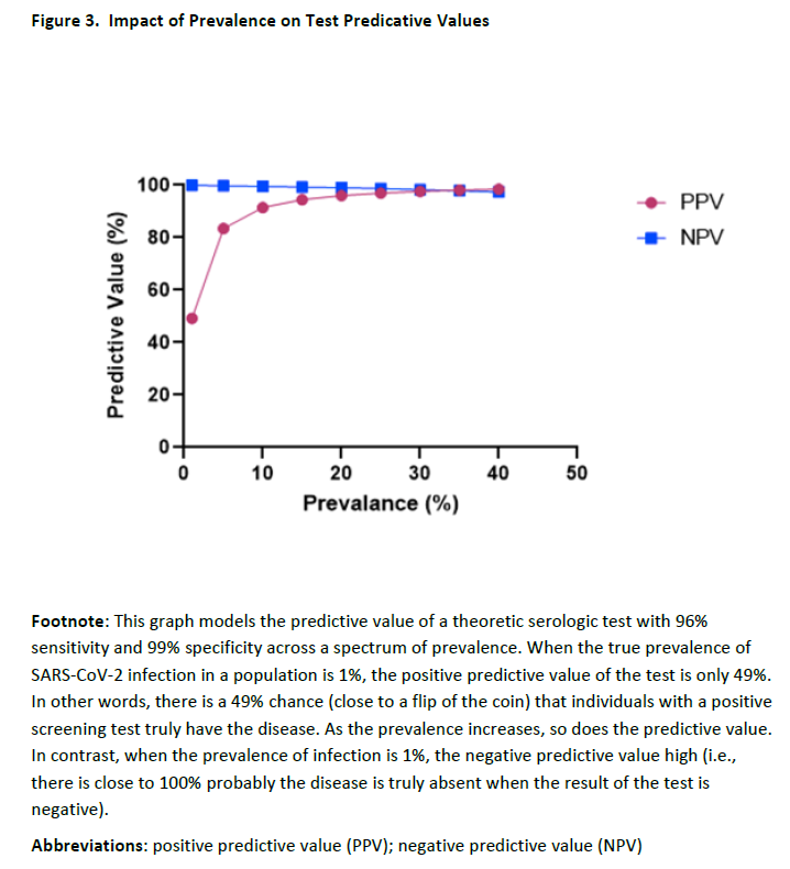 If performed within 14 days of onset of symptomatic infection, the low sensitivity of serologic tests can lead to a high number of falsely negative results. Individuals who test falsely negative would be classified as uninfected, when, in fact, they would be infected but they would not have developed a detectable antibody response. Although the specificity of serologic testing was calculated to be 98-99%, this likely does not represent performance in vaccinated and/or previously infected individuals, who were not assessed in the included studies. Tests with low specificity can lead to false positive result for recent infection at any time point of testing. A positive result can lead to the incorrect conclusion that an individual has been recently infected, thus eliminating the search for the true etiology of their symptoms, or resulting in unnecessary treatment or isolation.
