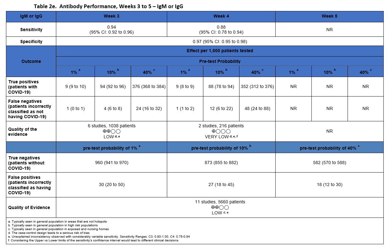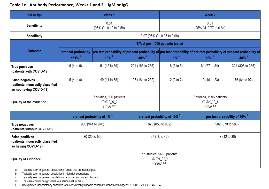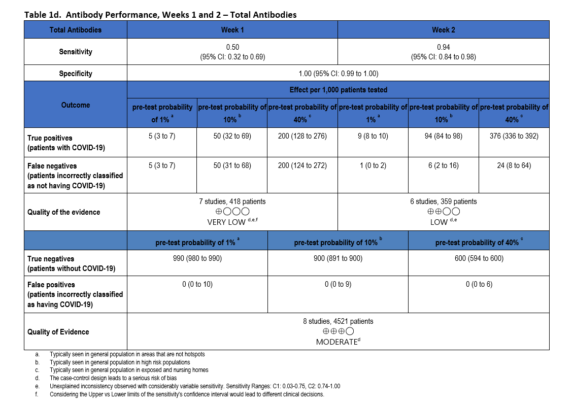 The quality of evidence that informed sensitivity determinations was low, while the quality of evidence that informed specificity was moderate. Quality was rated downward for both sensitivity and specificity due to serious indirectness and unexplained inconsistency in sensitivity. Concerns with indirectness stemmed from the participants being evaluated in the pre-vaccination era, and before widespread infection. Given the very high global estimates of current SARS-CoV-2 seroprevalence, the test accuracy estimated from these studies would likely not reflect performance today.