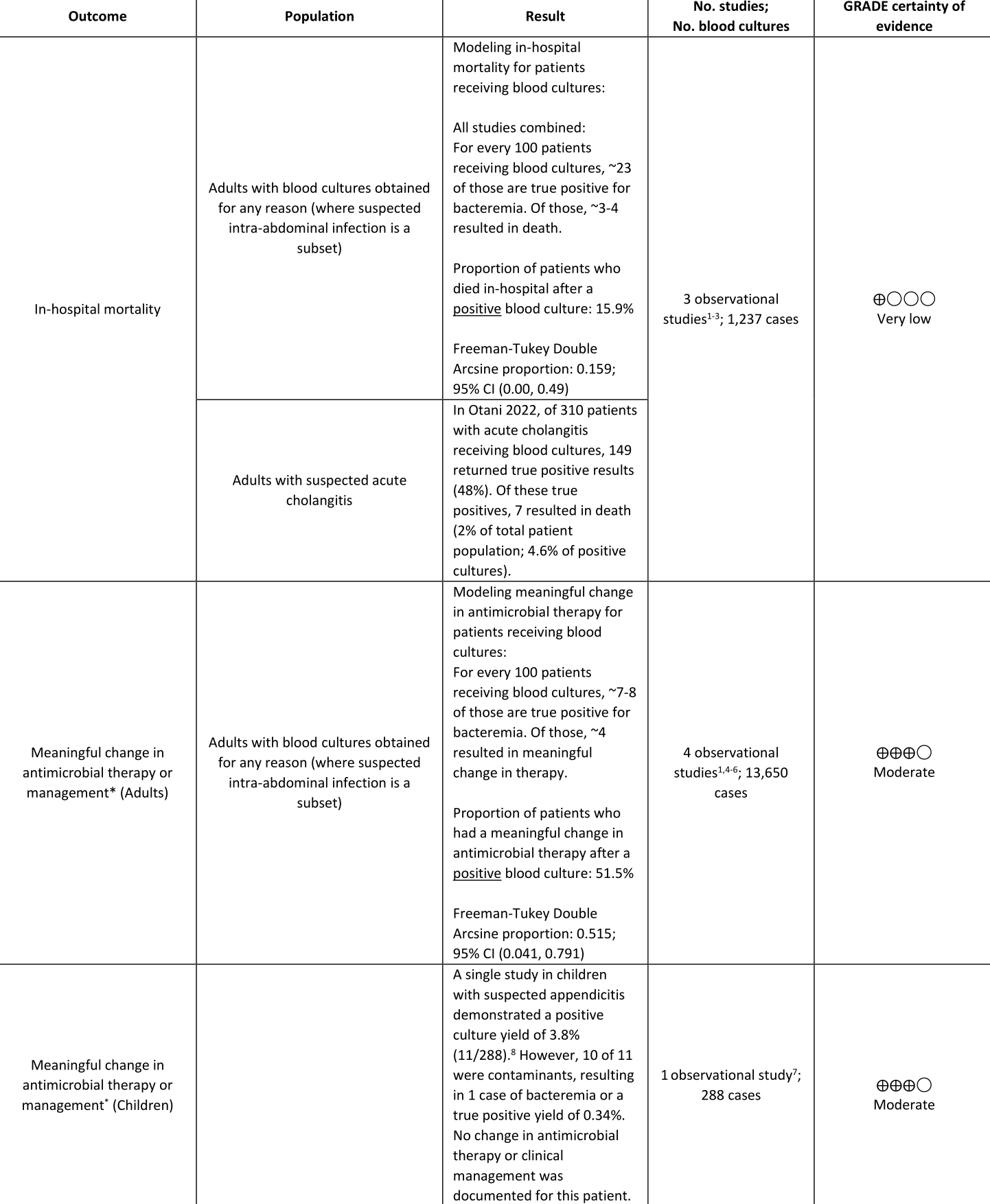 Seven observational studies1-7 were identified which addressed our prioritized outcomes of mortality and change in antimicrobial therapy. Only two of these studies3,7 were specific to patients with intra-abdominal infection. Other studies included a subset of patients with intra-abdominal infection in addition to patients receiving blood cultures for any other reason.
