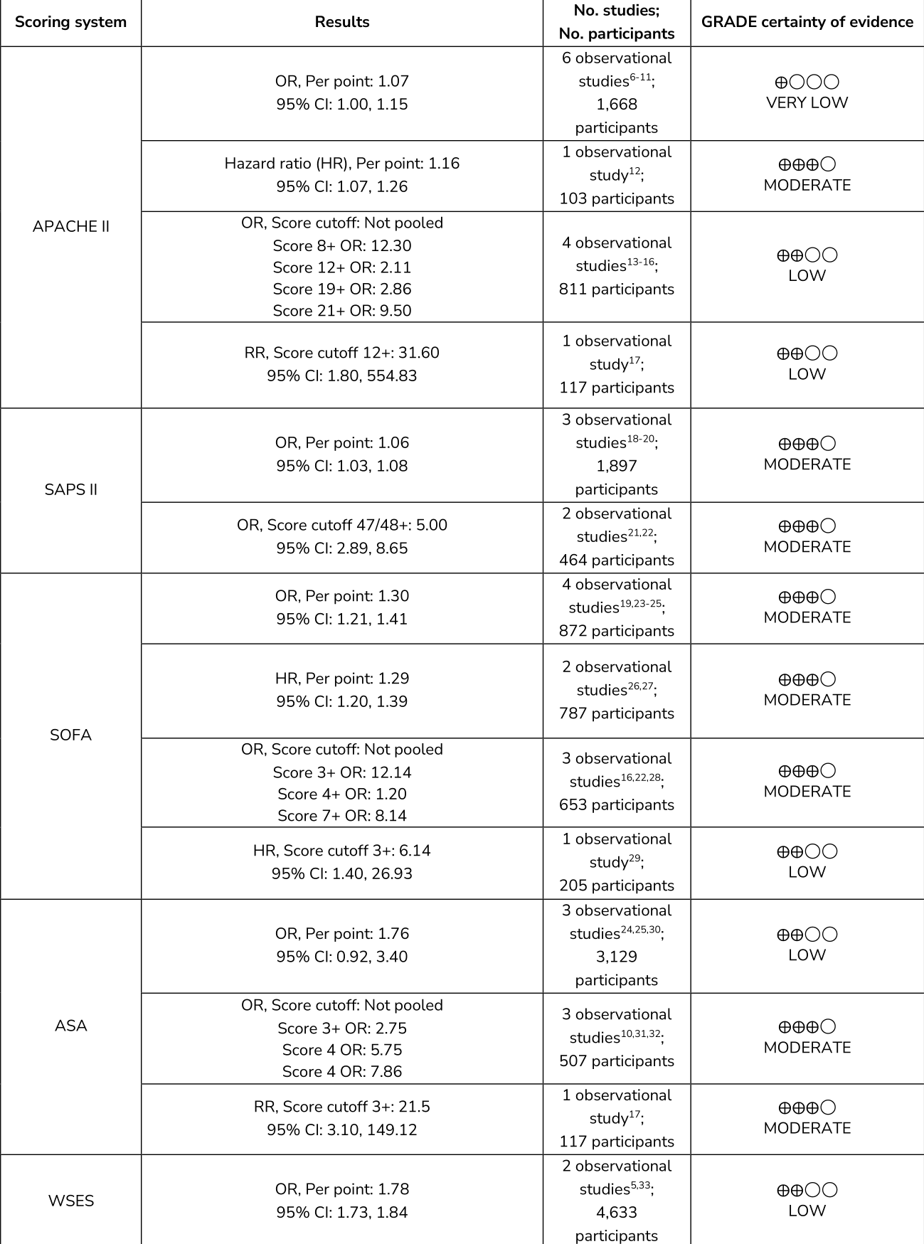 Over 20 different severity of illness scoring systems have been reported in the studies found. The four most common scoring systems were all disease-nonspecific and included: APACHE II,1 SOFA (Sequential Organ Failure Assessment),2 SAPS II (Simplified Acute Physiology Score II),3 and ASA (American Society of Anesthesiologists).4 These four scoring systems were selected for systematic review and meta-analyses. The WSES Sepsis Severity score5 for patients with complicated intra-abdominal infection was also analyzed.