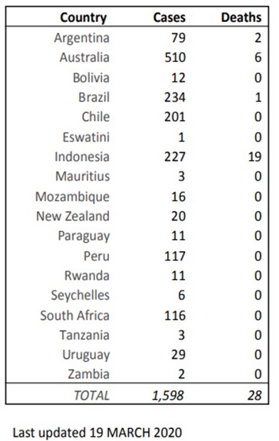 Table 1. Southern Hemisphere Nations with Cases and Deaths. (Data extracted and tabulated from WHO reports though 19 March 2020 by Nellie Darling, MS).