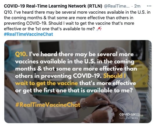 The chat with a panel of infectious diseases specialists and other medical experts, was hosted on Twitter by the Real Time Learning Network, a COVID-19 information resource coordinated by IDSA (which produces this blog), with support from the U.S. Centers for Disease Control and Prevention. It highlighted continuing unknowns about both the coronavirus and the vaccines developed to contain it.