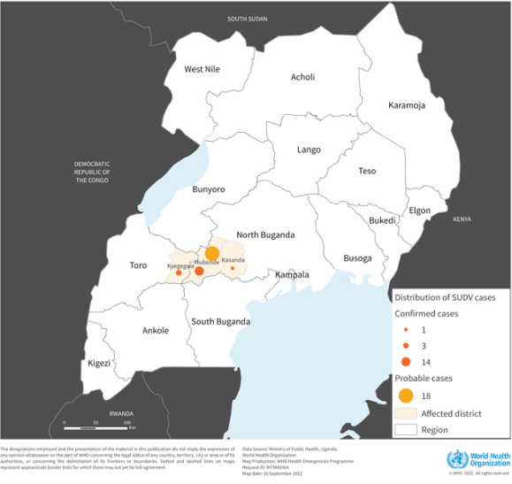 WHO map image from “Ebola Disease caused by Sudan virus – Uganda 26 September 2022,” https://www.who.int/emergencies/disease-outbreak-news/item/2022-DON410