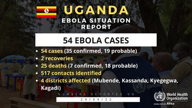 On Oct. 1, WHO’s Regional Office for Africa reported on Twitter that a fourth district, Kagadi, in western Uganda (away from Kampala) had joined Mubende, Kassanda and Kyegegwa in reporting cases: