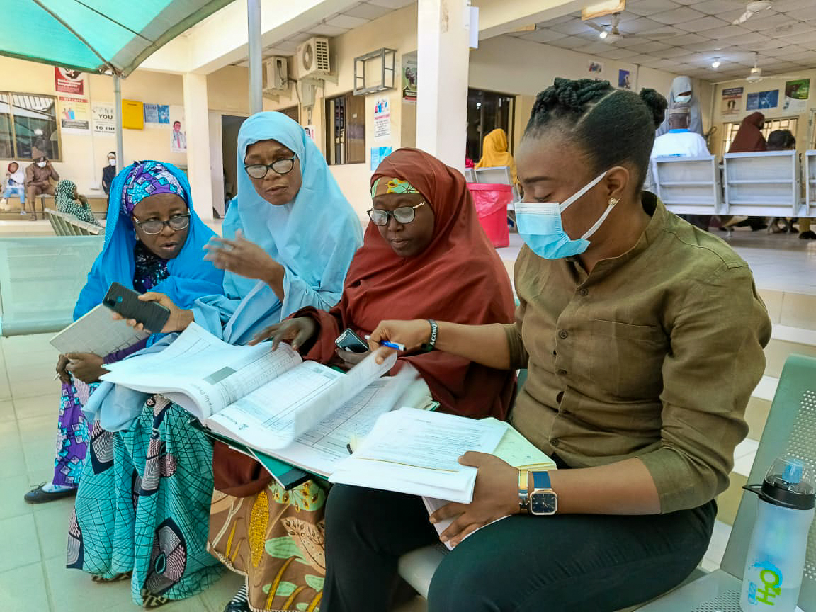 Photo: Providing hands-on capacity building to a government of Nigeria implementing partner and facility staff at Aminu Kano Teaching Hospital in Kano, Nigeria, on Dec. 12, 2022. Pictured, from left: Asma’u Shuaibu (health officer, GGHN- ACE 2 project); Hajara O Aliyu (mentor mother, facility staff); Maimuna Bala Idris (mentor mother, facility Staff); and Laurina Nyang (quality improvement specialist, Data.FI).