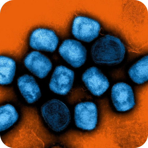 Image: Colorized transmission electron micrograph of mpox virus particles (blue) cultivated and purified from cell culture. Image captured at the NIAID Integrated Research Facility in Fort Detrick, Maryland. Credit: NIAID